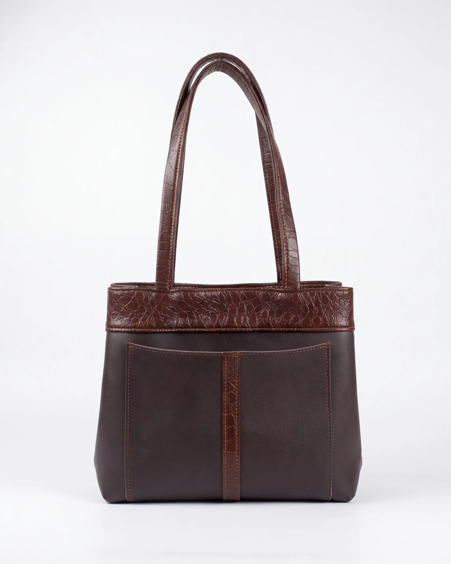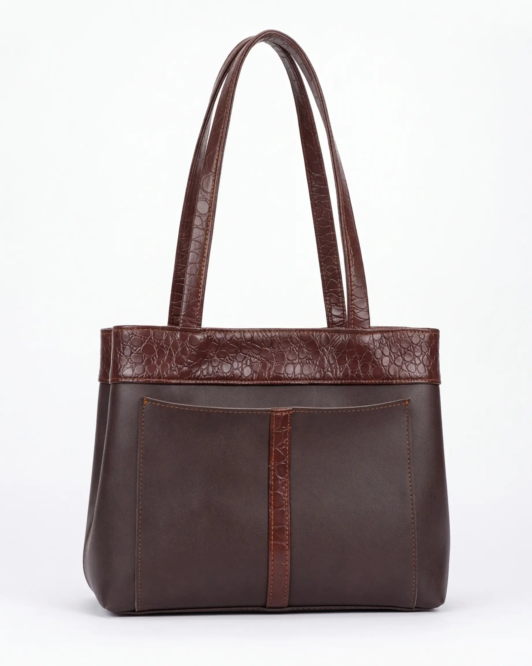 The design features a sophisticated dual-texture aesthetic, pairing a smooth chocolate brown body with a refined crocodile-embossed trim. Architectural stitching and reinforced shoulder straps provide the structural integrity needed to carry a full load comfortably and securely.